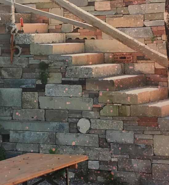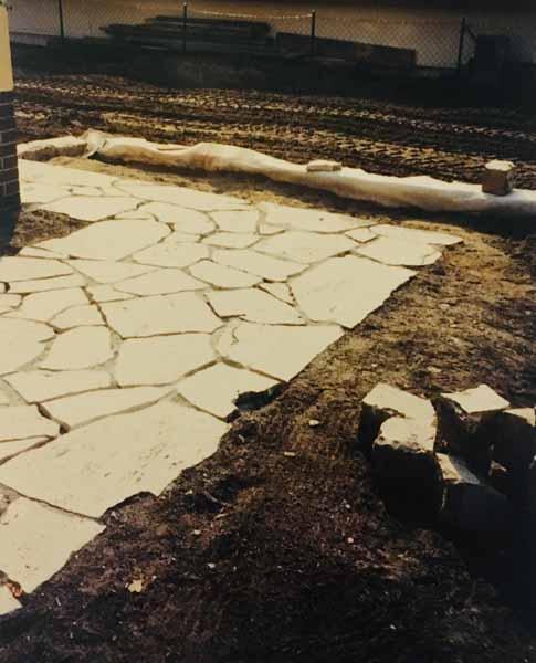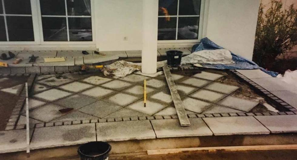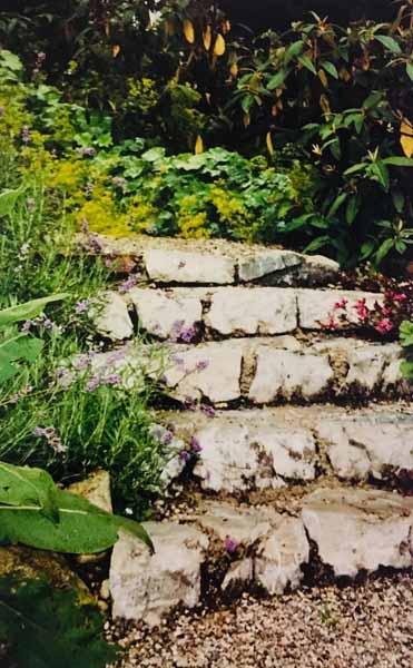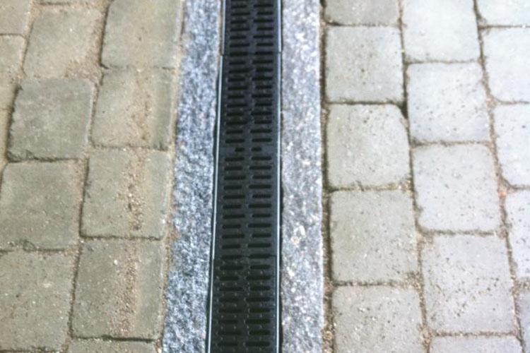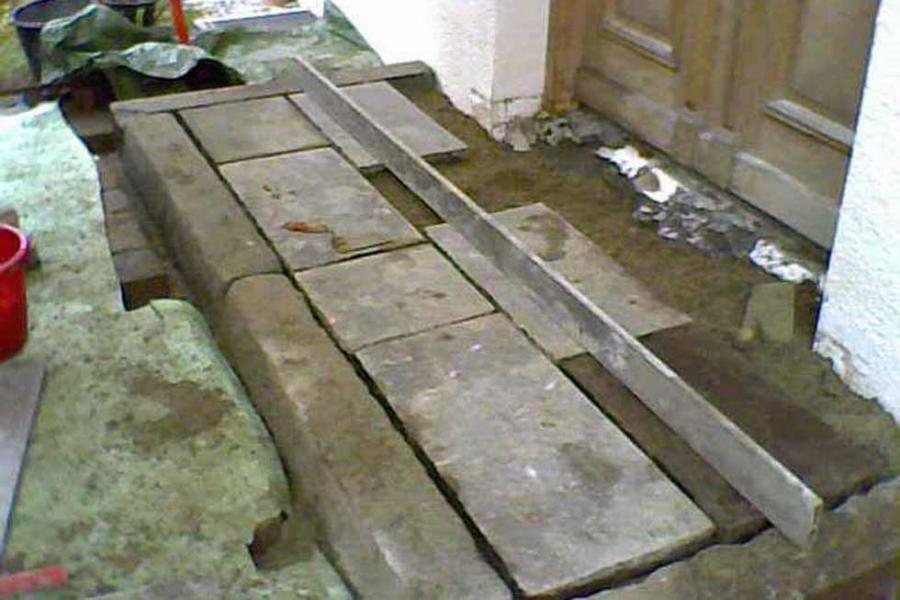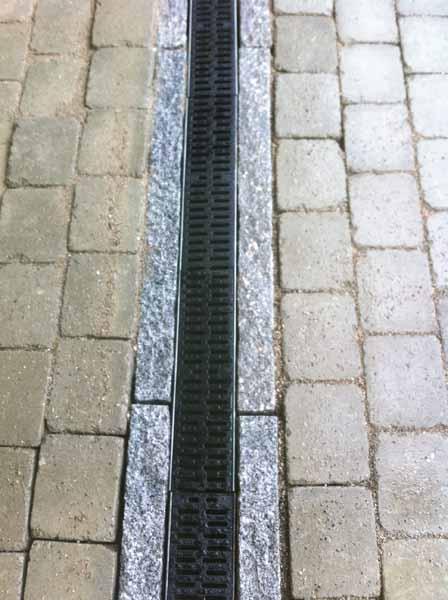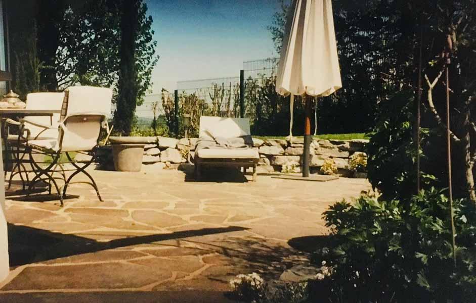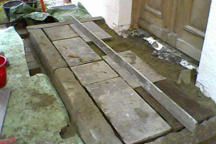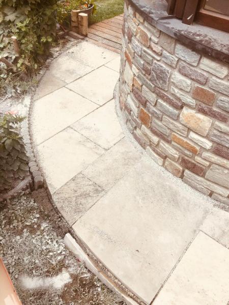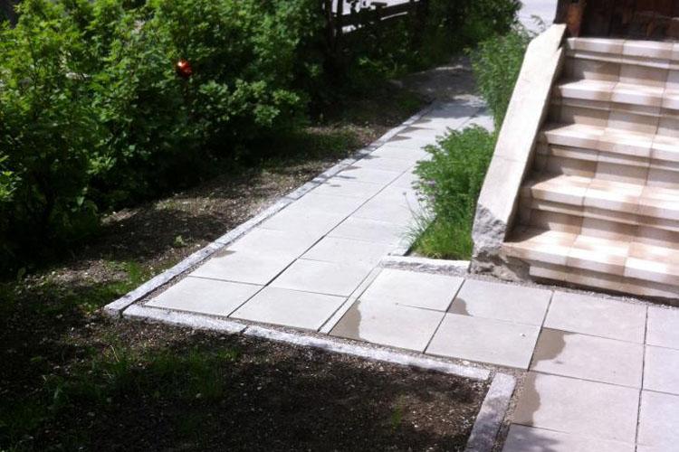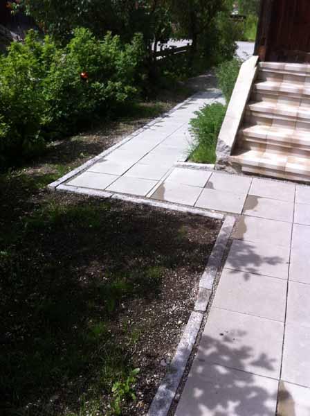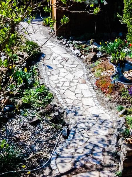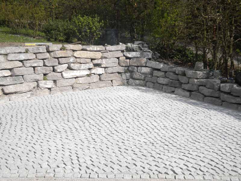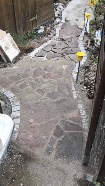 Polygonal-Verband aus Kalksteinplatten mit Einfassung aus Kleinstein Granit
