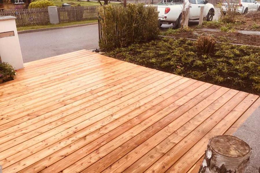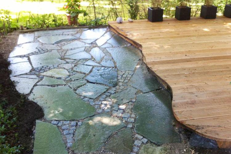 Granitplatten polygonal mit Mosaik ausgepflastert neben Holzdeck